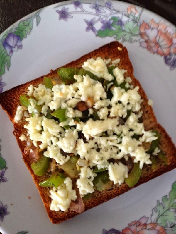 In kadai add little olive oil saute onion, capsicum, paneer. Add salt, oregano, chilli flakes. Spread ths on bread and sprinkle grated paneer on top. Cook on griddle or in preheated oven for 5 mins and serve